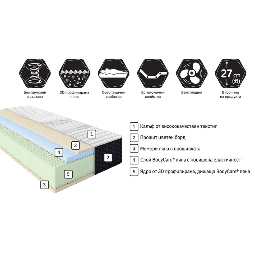 Матракът се отличава с ядро от 3D профилирана BodyCare пяна, която не само осигурява висок комфорт, но и подпомага циркулацията на въздуха, гарантирайки здравословен сън.