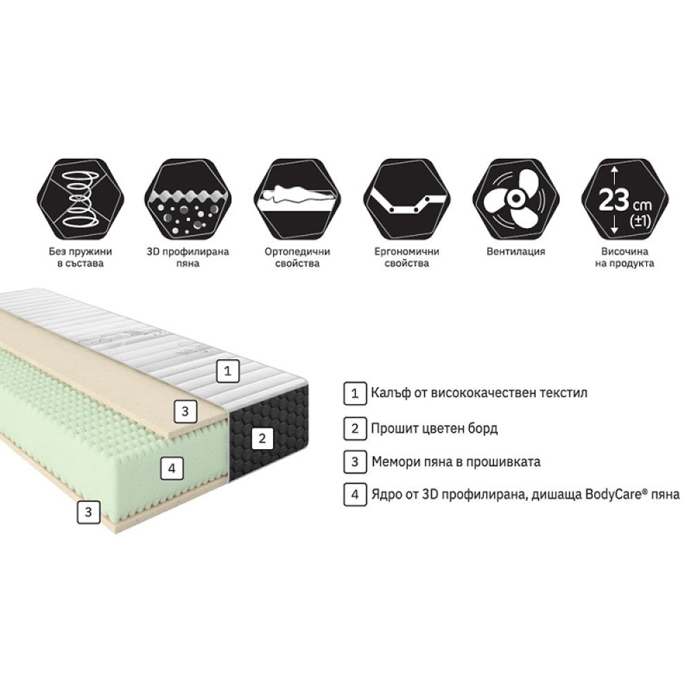 Със специално профилирано ядро от BodyCare пяна, този матрак предоставя леко масажиращо усещане, което стимулира кръвообращението и осигурява спокоен и здравословен сън.