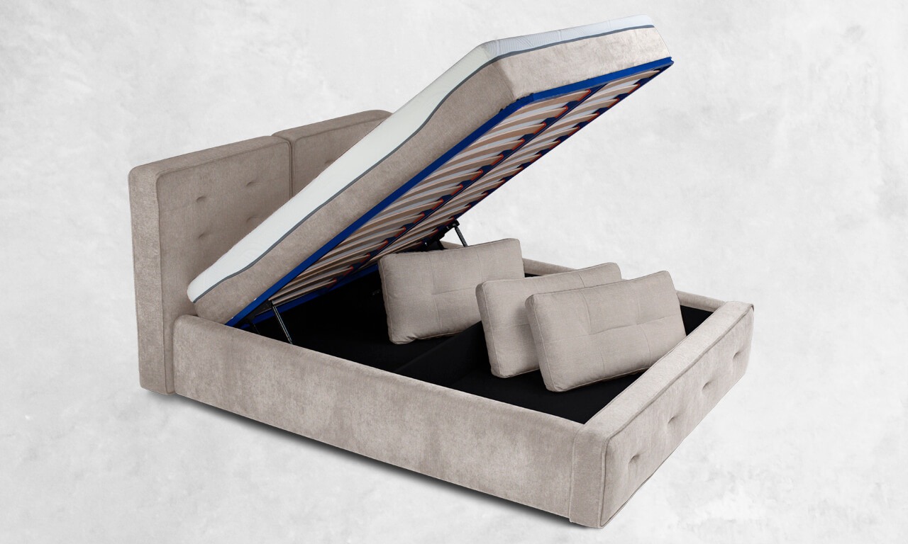 За удобство е монтиран и амортисьорен механизъм за лесно повдигане. Под нея е обособена голяма ракла за съхранение на дрехи и вещи. Обемната мека табла е тапицирана с мебелна дамаска, и допринася за комфорта и удобството при ползване.