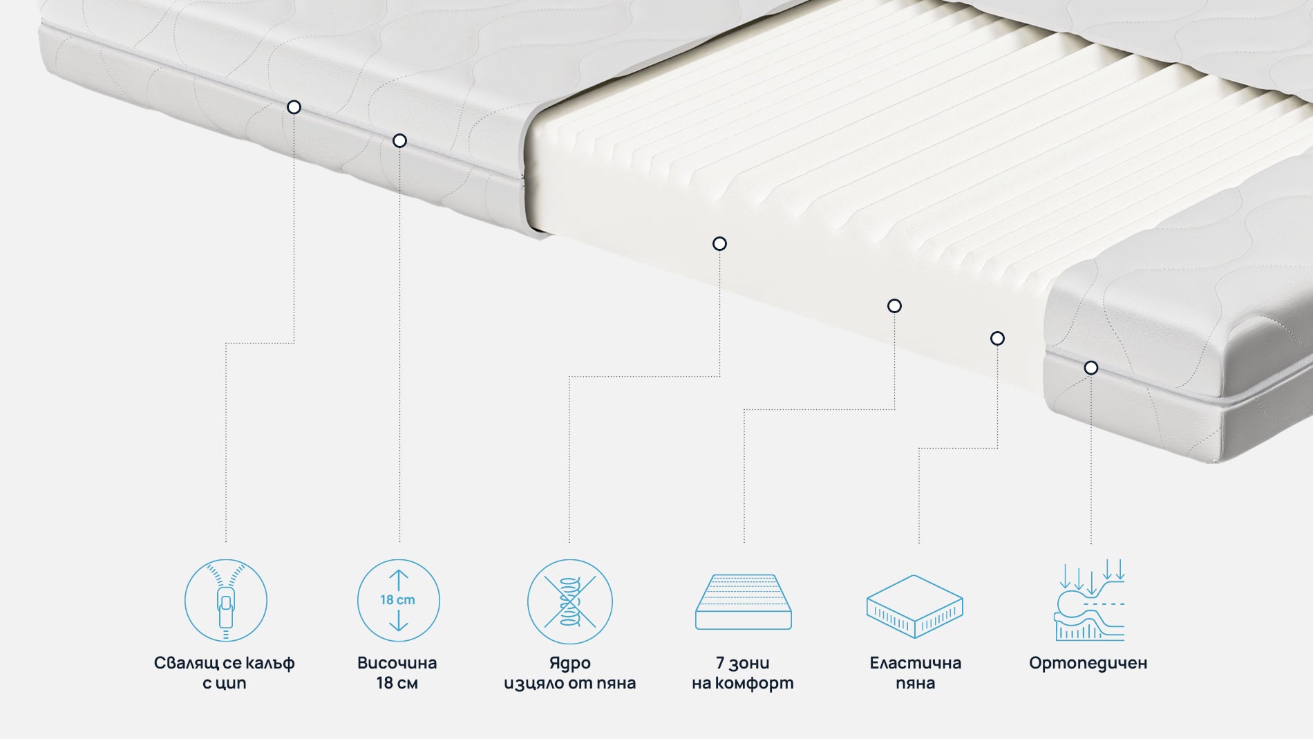 Ядро от 7-зонова еластична пяна, 16 см еластична пяна и микрофибърен текстил.