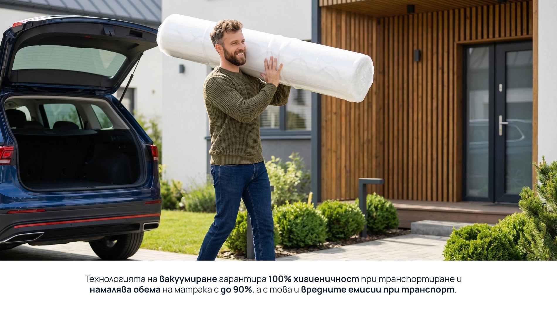 - Технологията на вакуумиране гарантира 100% хигиеничност при транспортиране и намалява обема на матракът с до 90%, а с това и вредните емисии при транспорт.