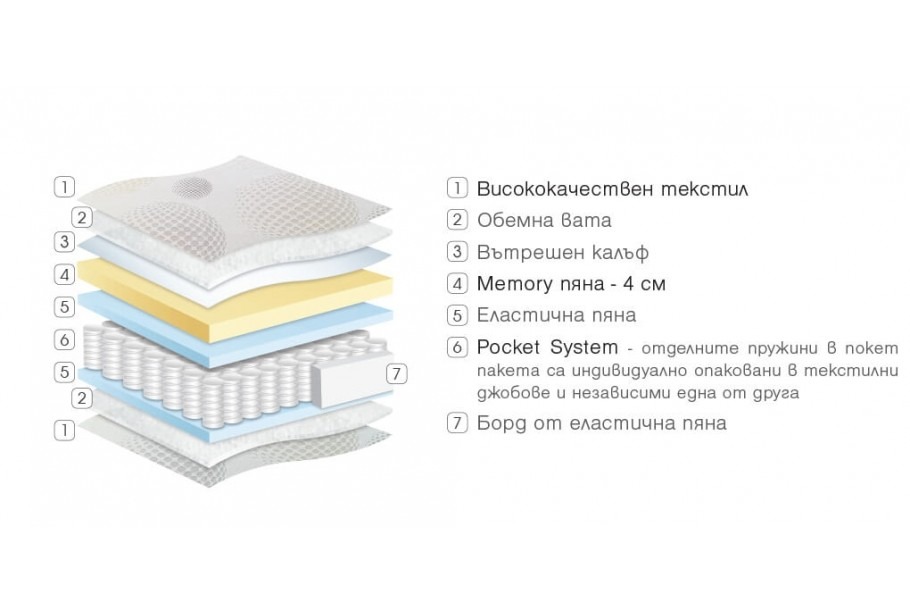 Високоеластичната пяна, използвана в матраците е с висока плътност, което осигурява равномерно разпределение на тежестта, а вложената мемори пяна минимизира въртенето, като обхваща тялото ви спрямо неговите извивки.