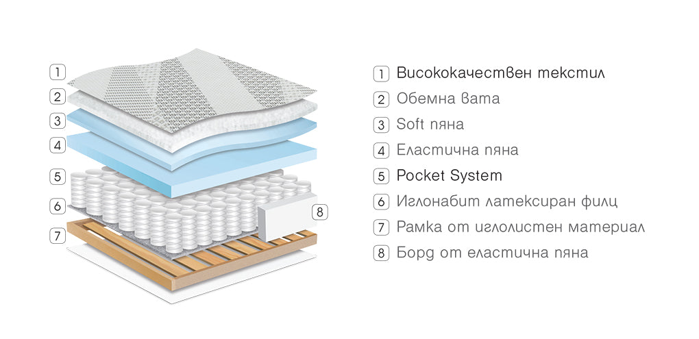 Високоеластичната пяна, използвана в матраците е с висока плътност, което осигурява равномерно разпределение на тежестта, а вложената мемори пяна минимизира въртенето, като обхваща тялото ви спрямо неговите извивки.
