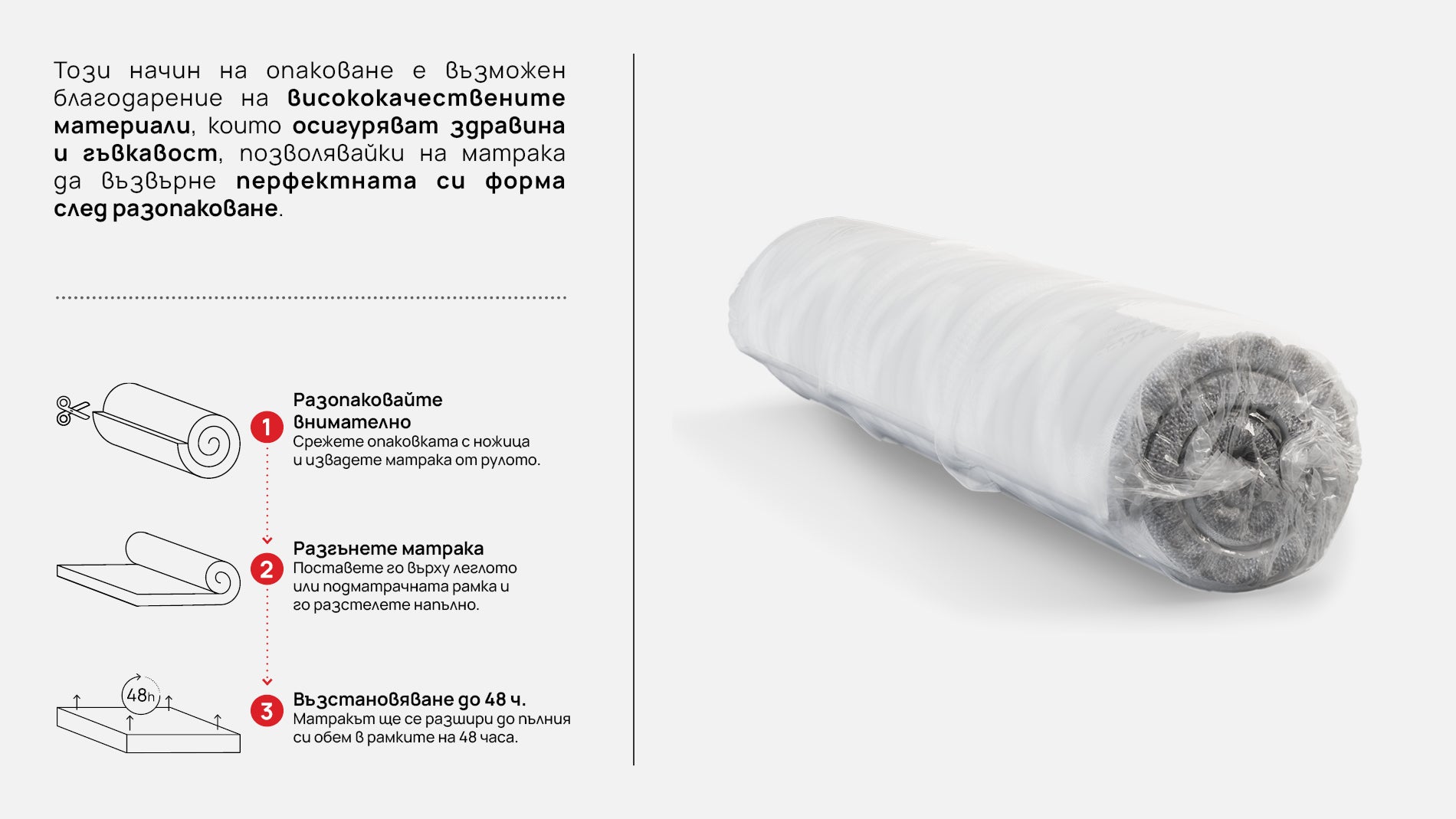 Всички матраци следва да бъдат разопаковани в рамките на 30 дни след получаване. След разопаковане, вакуумираният матрак има нужда между 24 и 72 часа, за да възстанови пълния си размер. В този период матрака НЕ трябва да бъде използван.