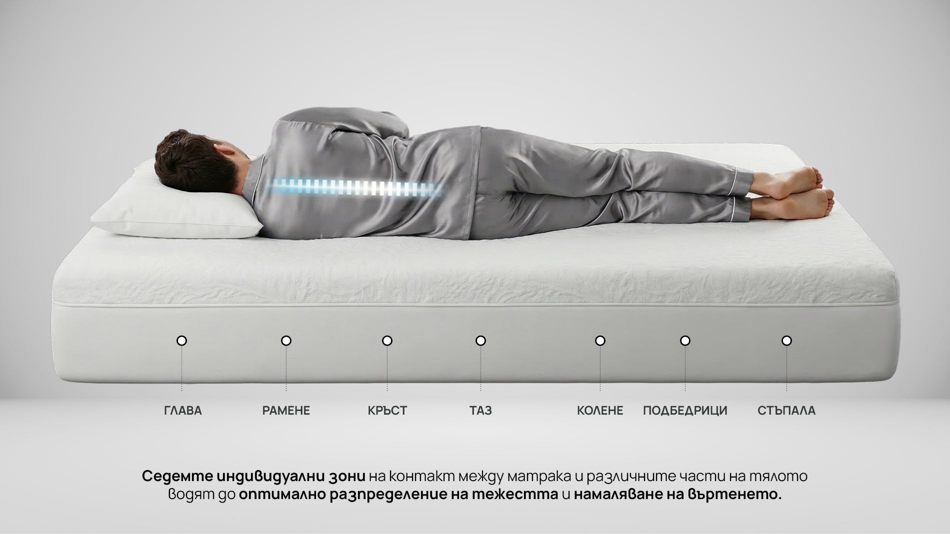 • Седемте индивидуални зони на контакт между матрака и различните части на тялото водят до оптимално разпределение на тежестта и намаляване на въртенето.