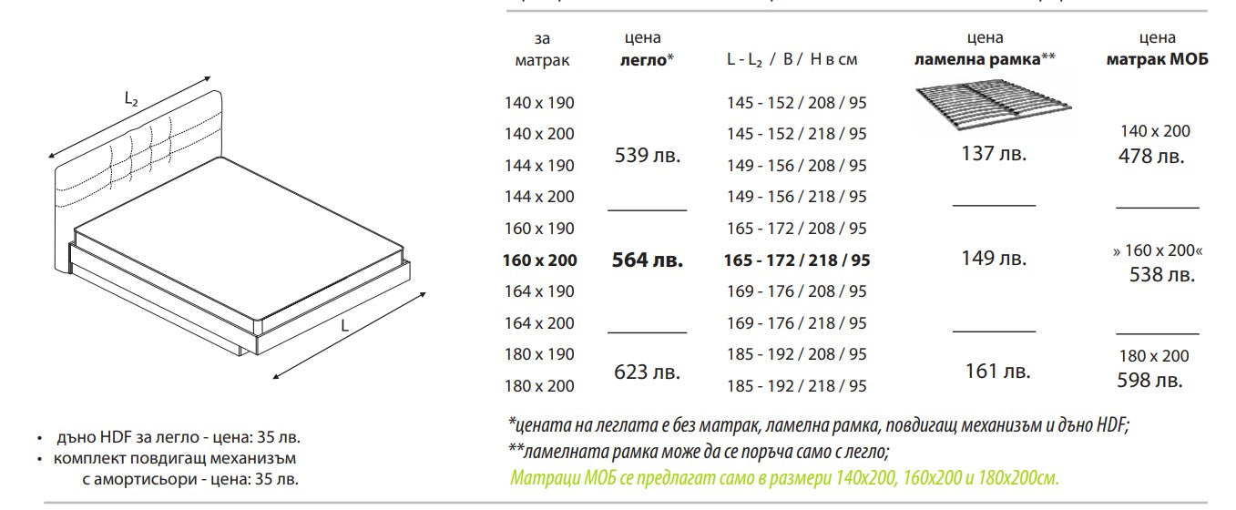 Тапицираните легла са окомплектовани с ламелна рамка, повдигащ механизъм с амортисьори и дъно HDF за легло.