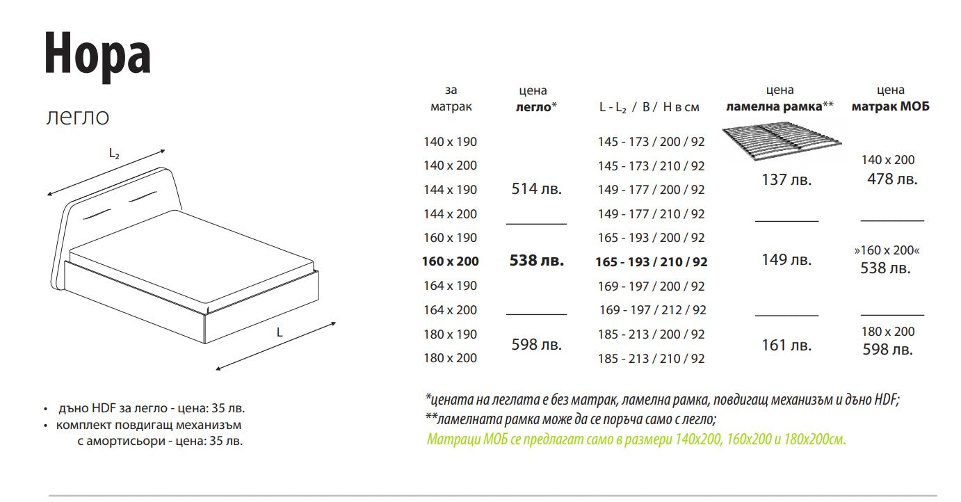 Тапицираните легла са окомплектовани с ламелна рамка, повдигащ механизъм с амортисьори и дъно HDF за легло.
