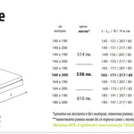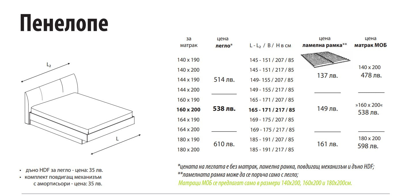 Тапицираните легла са окомплектовани с ламелна рамка, повдигащ механизъм с амортисьори и дъно HDF за легло.
