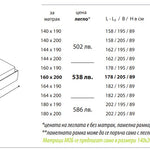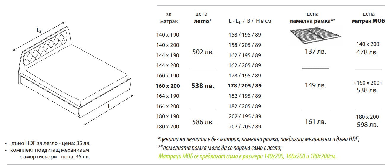 Тапицираните легла са окомплектовани с ламелна рамка, повдигащ механизъм с амортисьори и дъно HDF за легло.