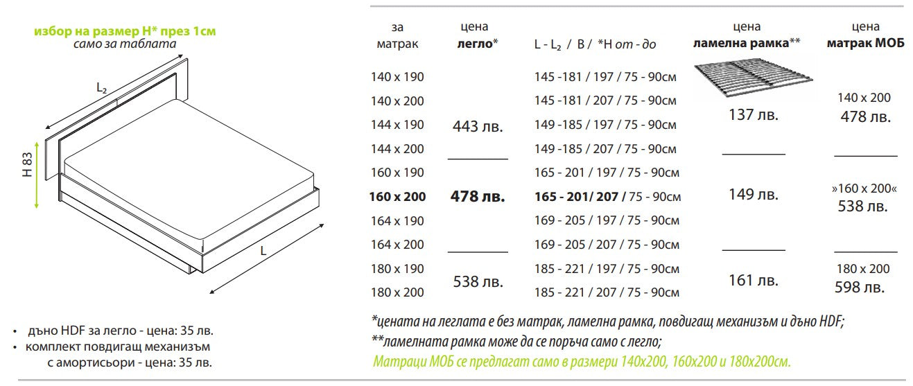 Тапицираните легла са окомплектовани с ламелна рамка, повдигащ механизъм с амортисьори и дъно HDF за легло.