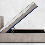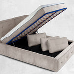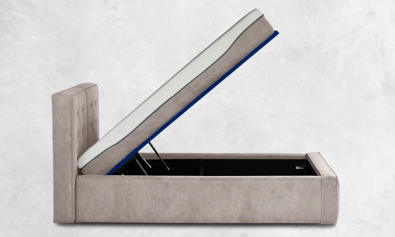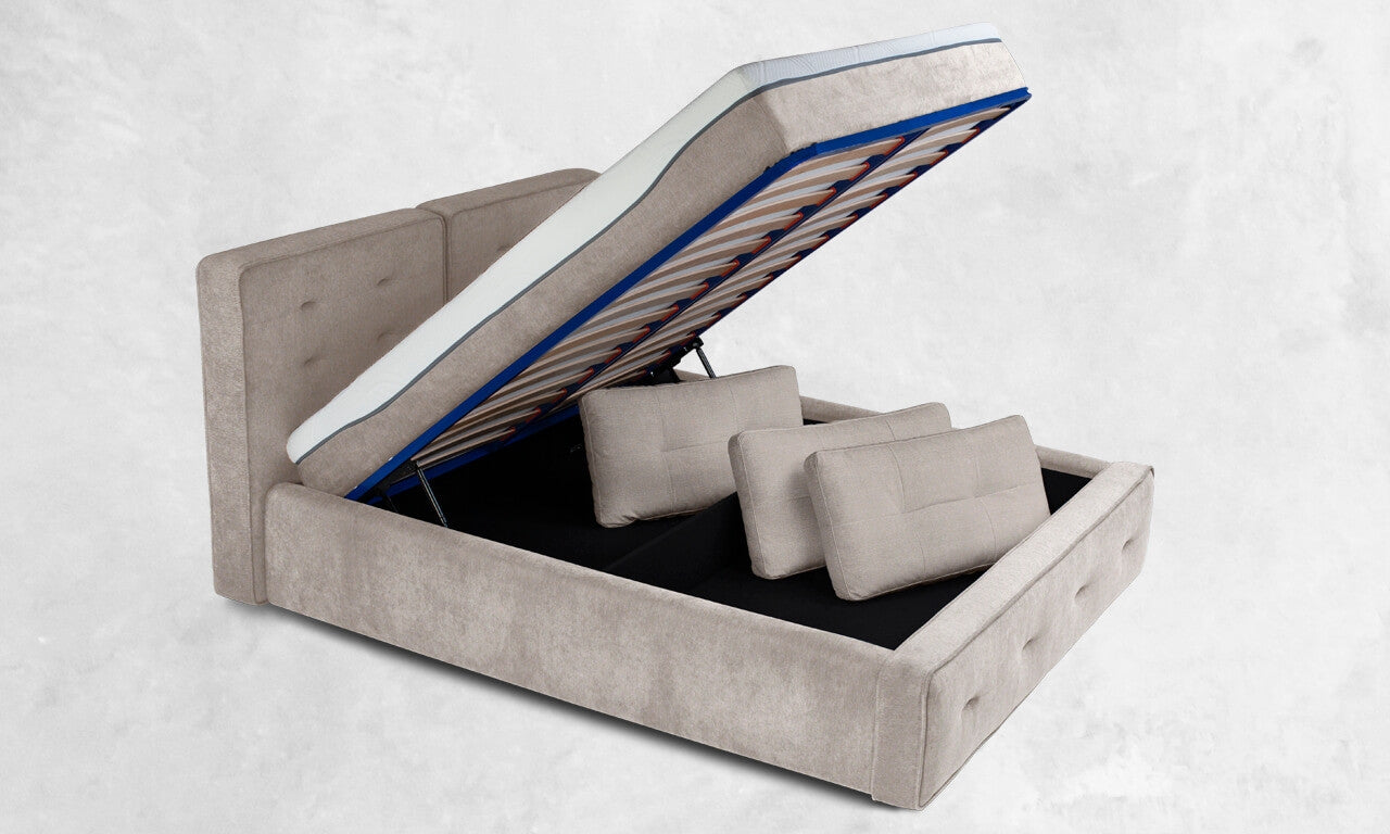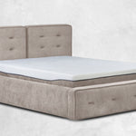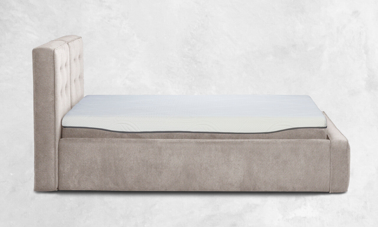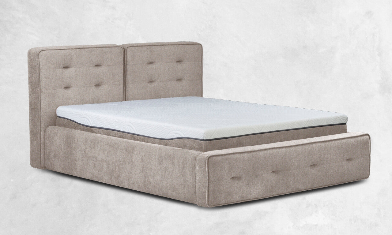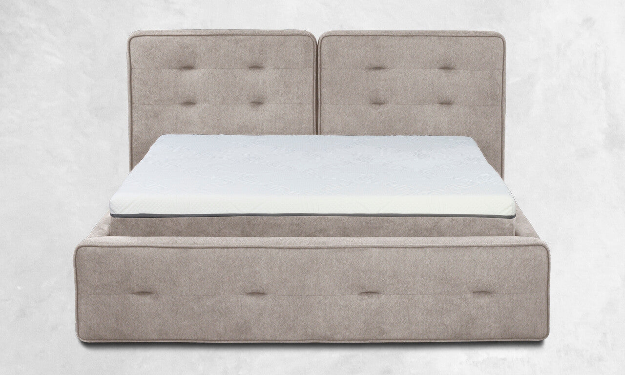 Модерна тапицирана спалня в комплект с вградена метална подматрачна рамка и еластични букови ламели.