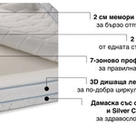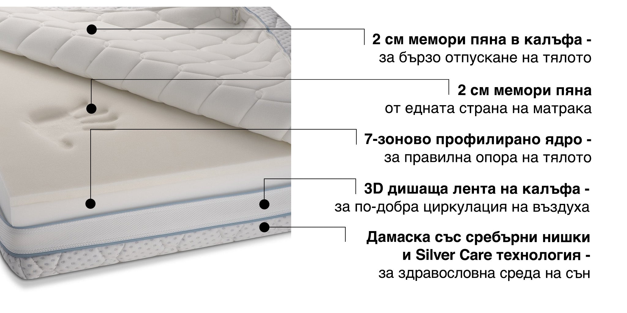 Ядро от 7-зонова еластична пяна, 2 см слой от мемори пяна + 2 см мемори пяна в текстила, 16 см еластична пяна и сребърни нишки в текстила.