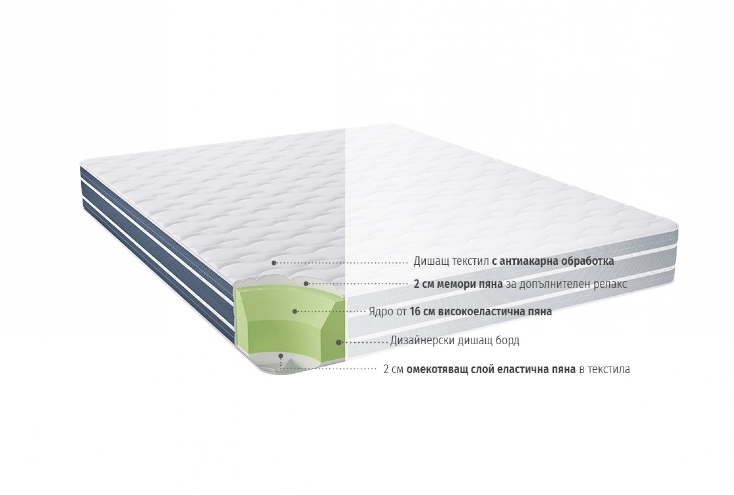 - Мемори пяната гарантира спокоен сън без въртене, като реагира на теглото и температурата на тялото и се адаптира към извивките му.