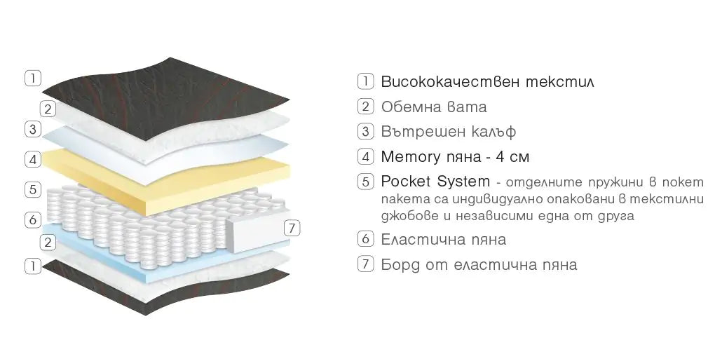 Състав на ядро Мемори пяна,Покет пружини,Пяна