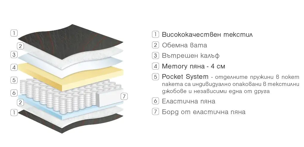 Матрак с ядро от pocket пружини и слой мемори пяна от едната страна.