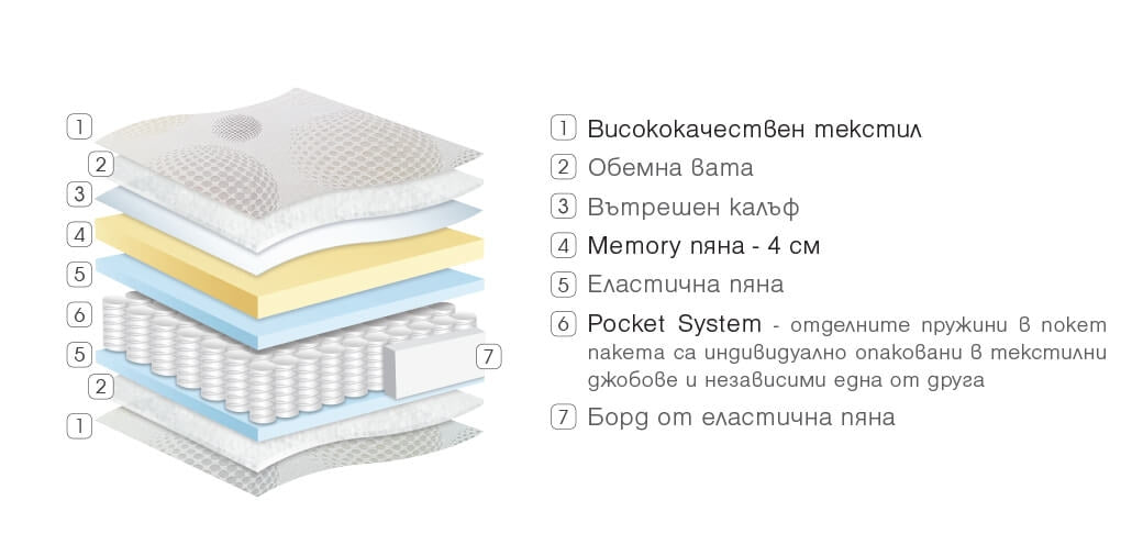 • Мемори пяната гарантира спокоен сън без въртене, като реагира на теглото и температурата на тялото и се адаптира към извивките му.