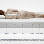 - Седемте индивидуални зони на контакт между матрака и различните части на тялото водят до оптимално разпределение на тежестта и намаляване на въртенето.
