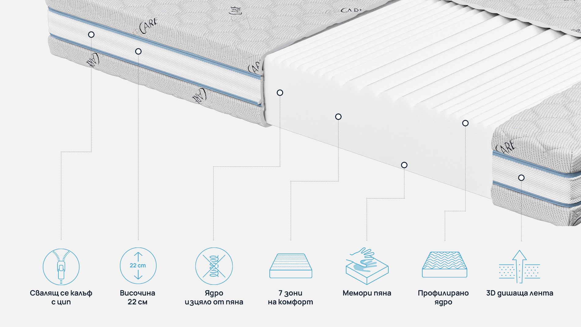 Ядро от 7-зонова еластична пяна, 2 см слой от мемори пяна + 2 см мемори пяна в текстила, 16 см еластична пяна и сребърни нишки в текстила.