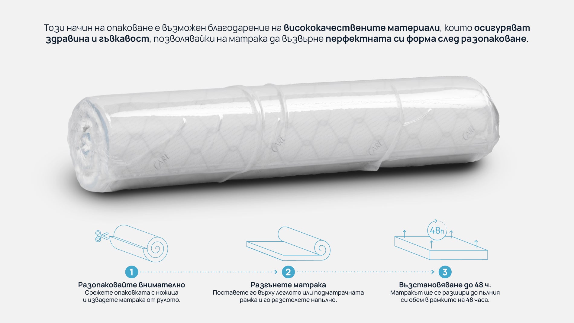 · След разопаковането на вакуумиран матрак или топ матрак е необходимо в рамките на 24 до 72 часа той да не бъде използван.