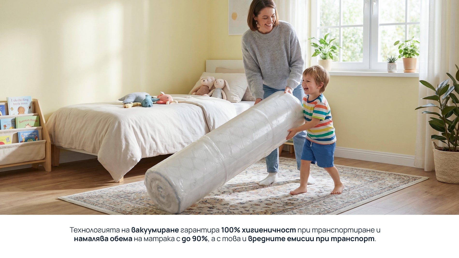 - Технологията на вакуумиране гарантира 100% хигиеничност при транспортиране и намалява обема на матракът с до 90%, а с това и вредните емисии при транспорт.