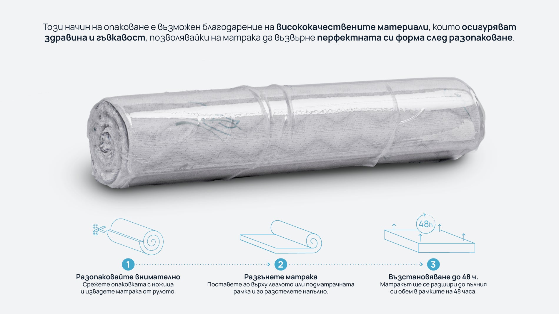 · След разопаковането на вакуумиран матрак или топ матрак е необходимо в рамките на 24 до 72 часа той да не бъде използван.