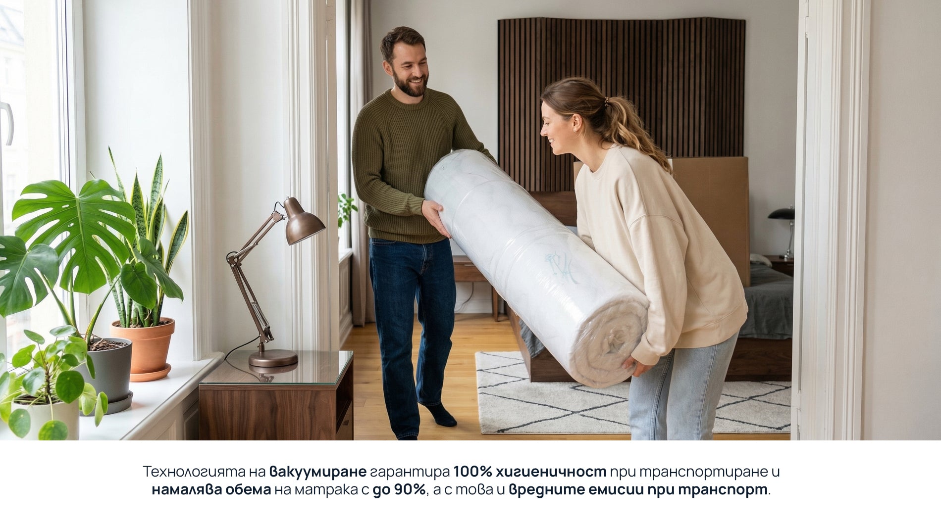 - Технологията на вакуумиране гарантира 100% хигиеничност при транспортиране и намалява обема на матракът с до 90%, а с това и вредните емисии при транспорт.