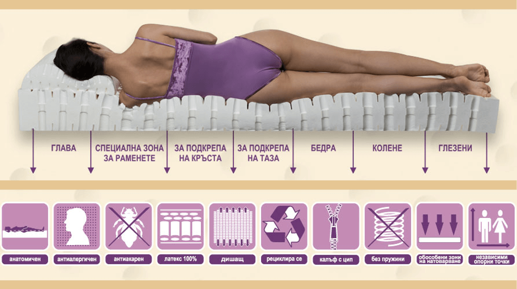 • Комфорт: латексът се адаптира към формата на тялото и облекчава напрежението в ключови зони, които оказват най-голям натиск