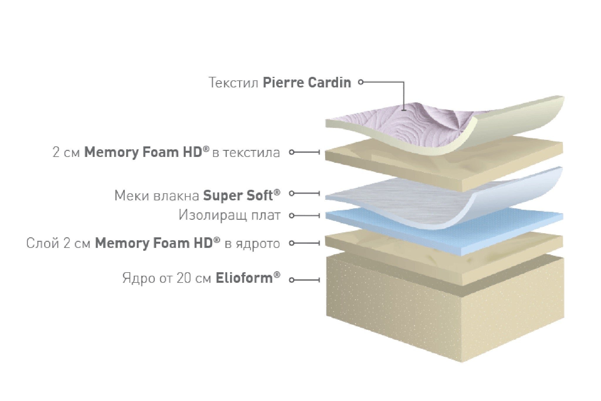 • Мемори пяната гарантира спокоен сън без въртене, като реагира на теглото и температурата на тялото и се адаптира към извивките му.