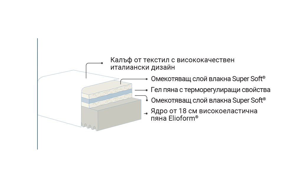 • Високоеластичната пяна предоставя стабилна опора на тялото по време на сън.