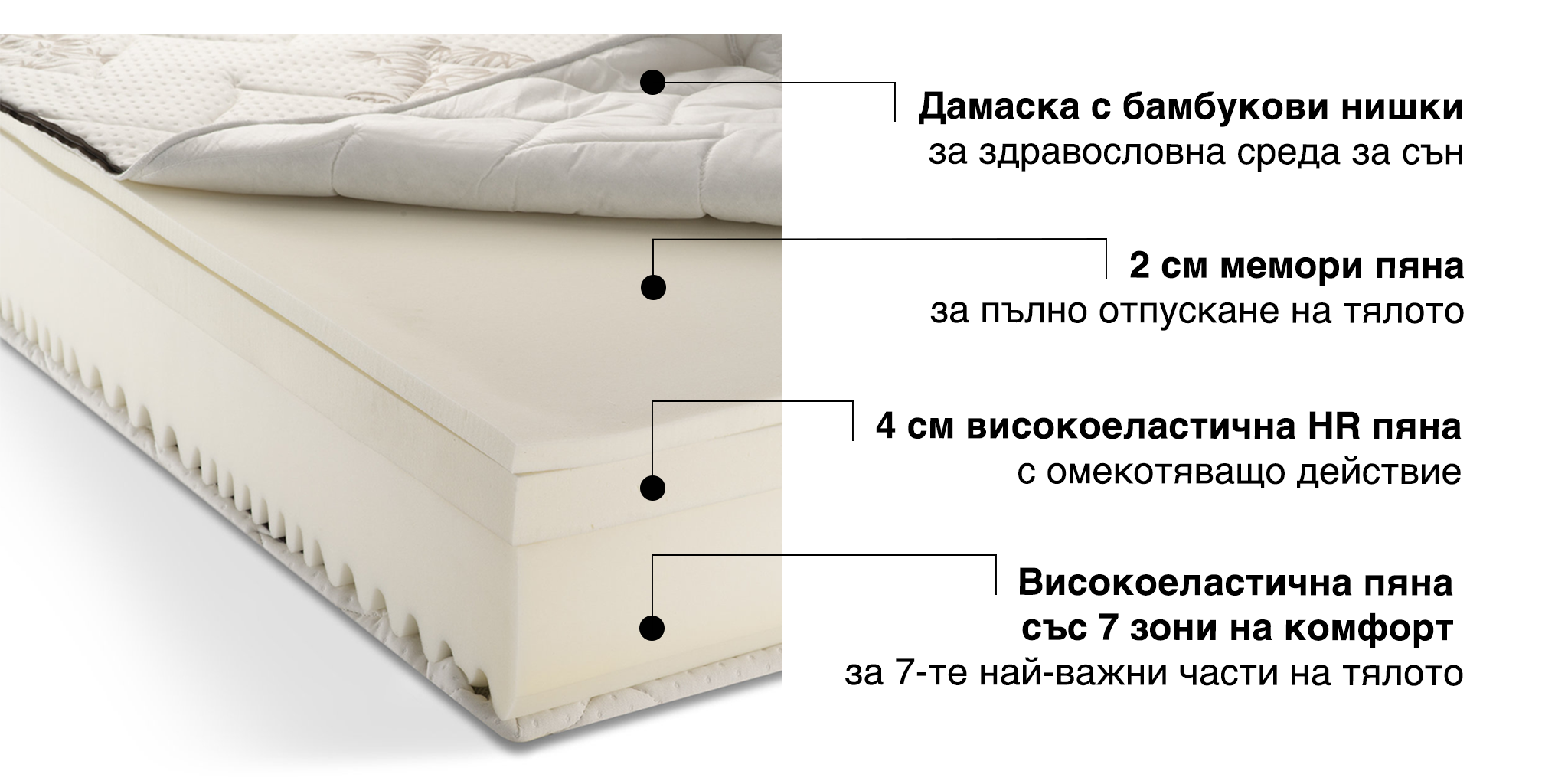 Ядро от 7-зонова еластична пяна, 2 см мемори пяна, 4 см високоеластична HR пяна, 12 см еластична пяна и бамбукови нишки в текстила.