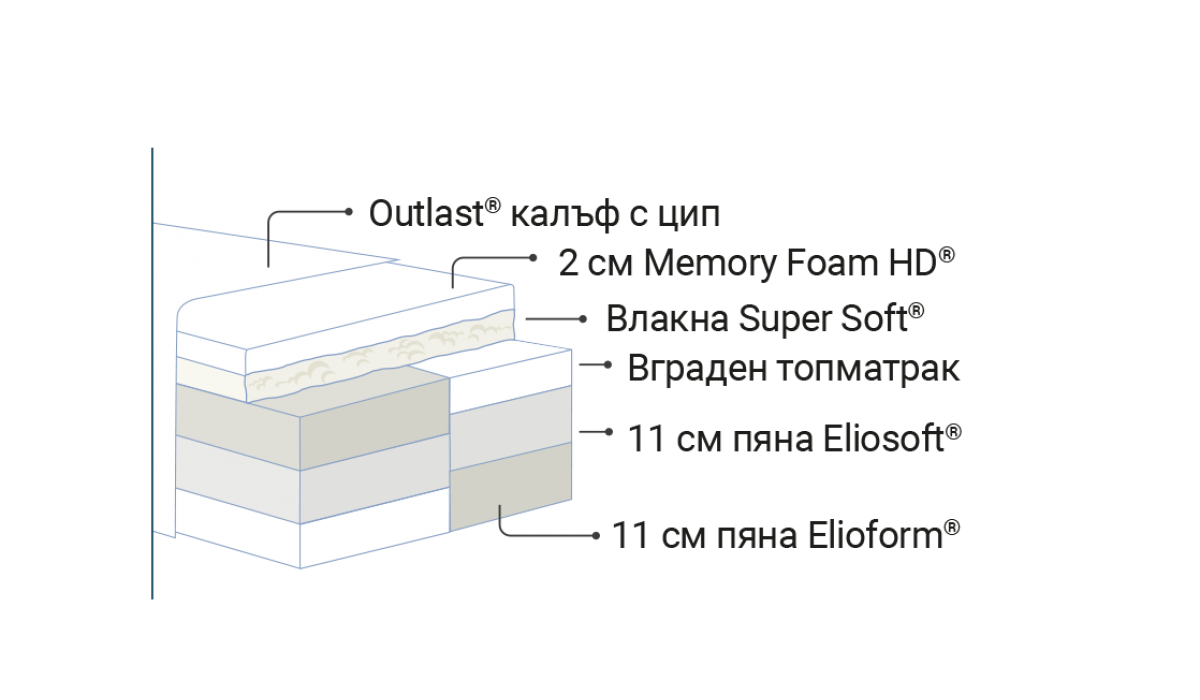 • Мемори пяната гарантира спокоен сън без въртене, като реагира на теглото и температурата на тялото и се адаптира към извивките му.