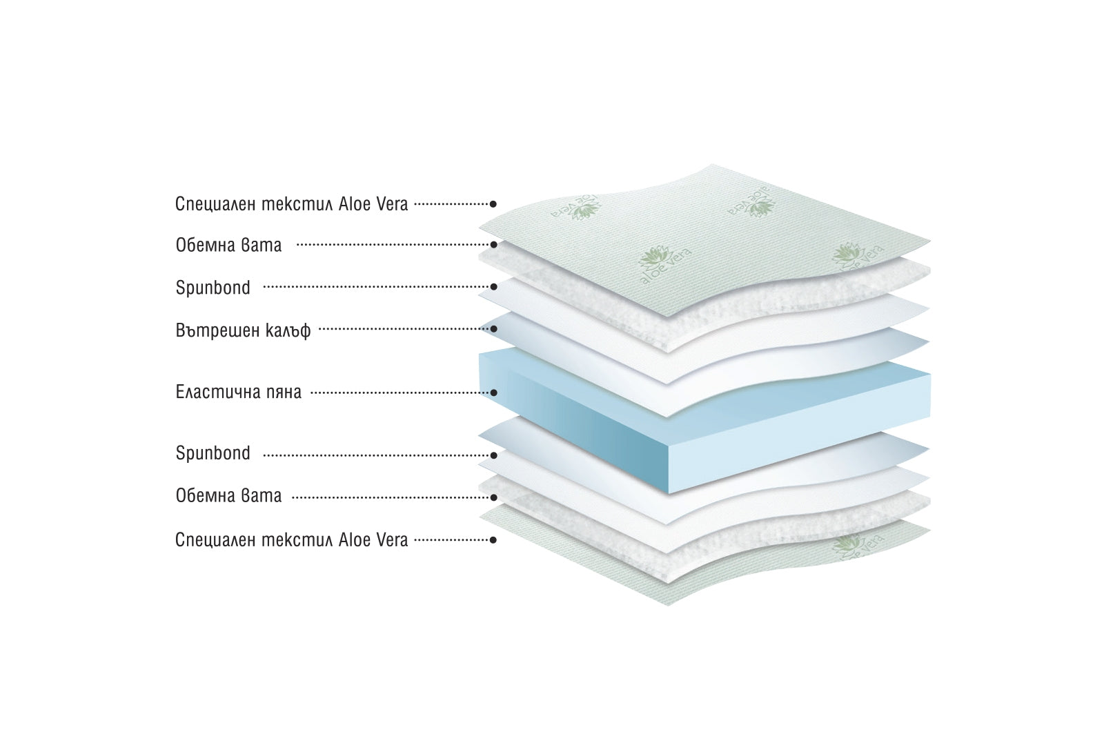 • Еднолицеви и двулицеви матраци с ядро от пружини Бонел или Покет, еластична пяна, високоеластична пяна, мемори пяна, охлаждаща мемори пяна, пяна със свойства на латекс