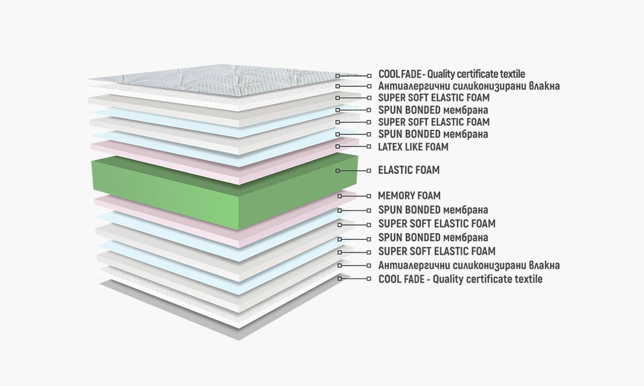 • Високоеластичната пяна предоставя стабилна опора на тялото по време на сън.