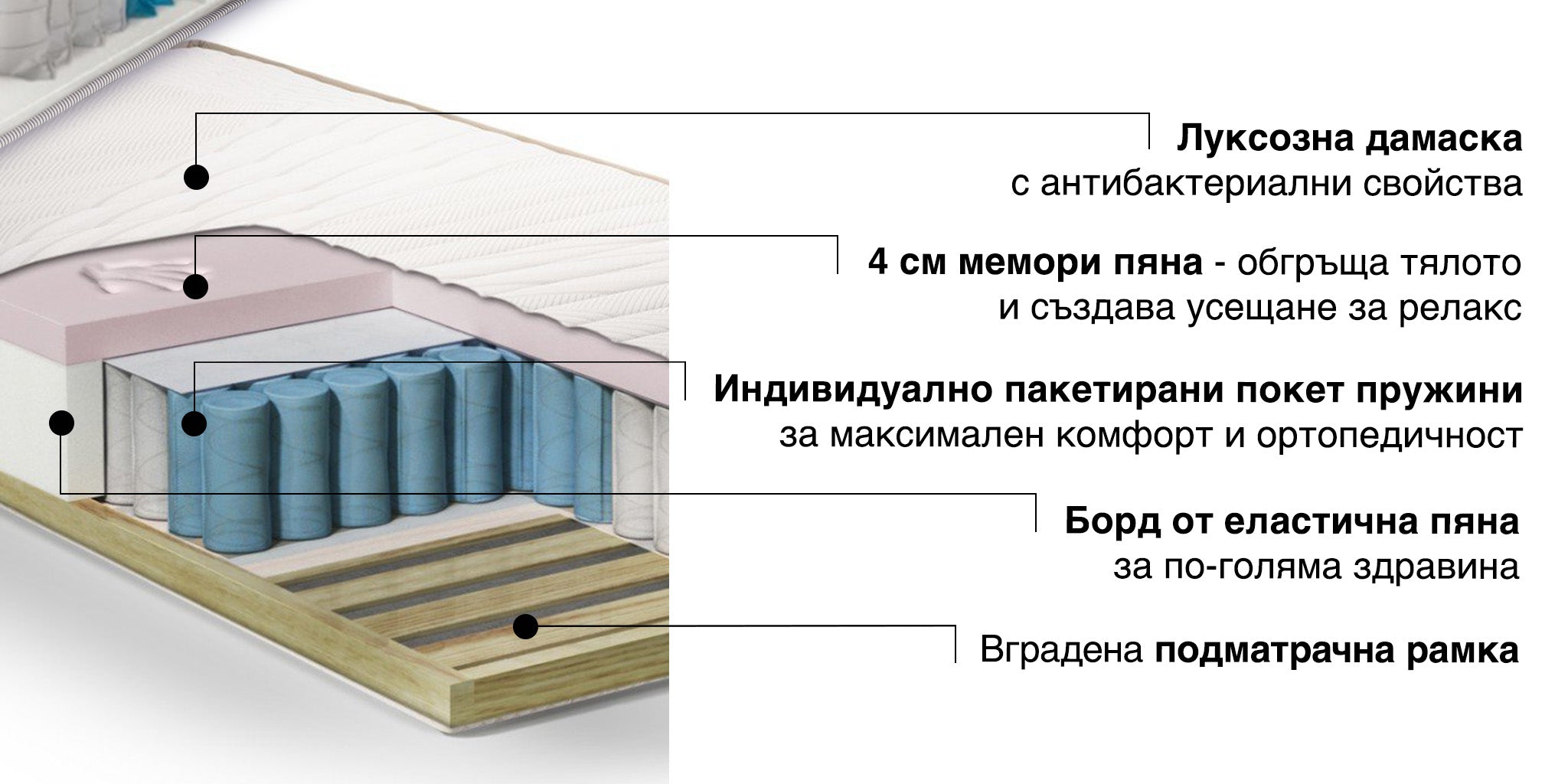 Еднолицев матрак с ядро от покет пружини, 4 см мемори пяна и сребърни нишки в текстила.