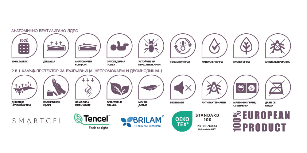 Всички продукти гарантират високо ниво на сънна хигиена като в повечето ще откриете лицензираната тъкан tencel. Тенселът е запазена марка на изобретена преди 30 години тъкан от изцяло естествени материали лиосел. За разлика от стандартните синтетични материали, тенселът се извлича от чиста дървесна целулоза, което я прави копринено гладка като усещане, издръжлива във времето и силно абсорбираща влагата от тялото.