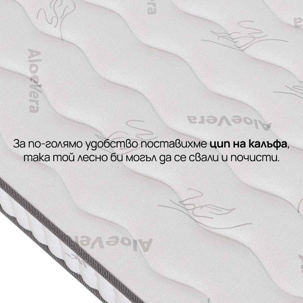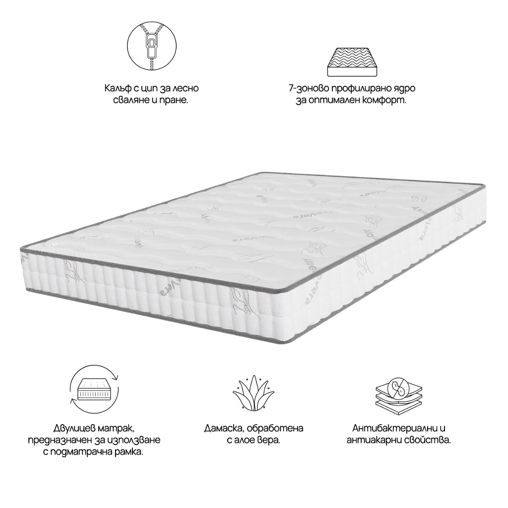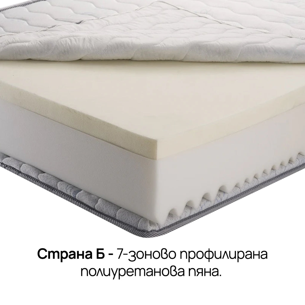 Насладете се на съвършен комфорт с двулицевия матрак с 4 см термочувствителна мемори пяна и 7-зоново профилирано ядро – идеалната комбинация за релаксация и правилна опора на тялото.