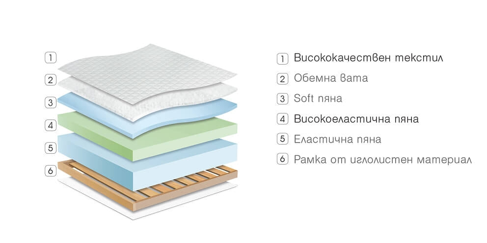 • Високоеластичната пяна предоставя стабилна опора на тялото по време на сън.